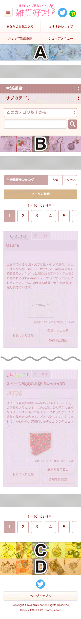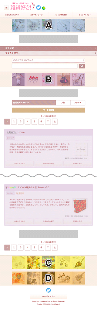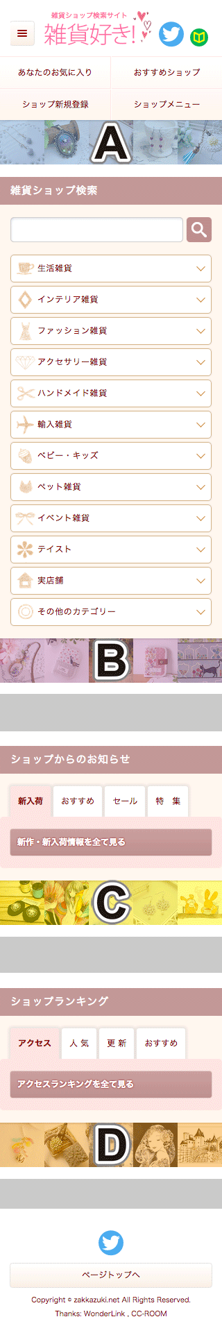 A・B・C・D の、4ヶ所の広告スペースがあり、1ショップ様1ヶ所につき1枠をお申し込みいただけます。