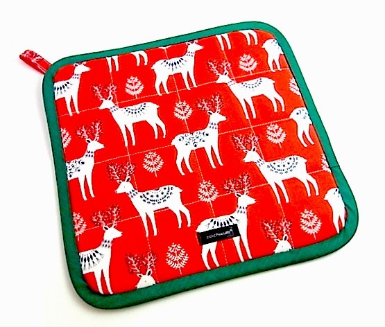 鍋しき 『トナカイ』 Colchicum* こちらは鍋しき『トナカイ』になります。 USAのデザイナーズファブリックを使用しております。クリスマスらしい発色の良いレッドを背景に真っ白なトナカイが並ぶデザイン。 トナカイの角は葉っぱの付いた枝、体にはドイリーのような細かい模様が入っています。クリスマスシーズンに使うと気分も上がりそうな柄ですね♪【大きさ】約H22cm角 【表、裏地】綿100% 【中地】ドミット芯2枚 詳細・ショップページへ 投稿日:2015/12/08(Tue) 23:07記事No:136