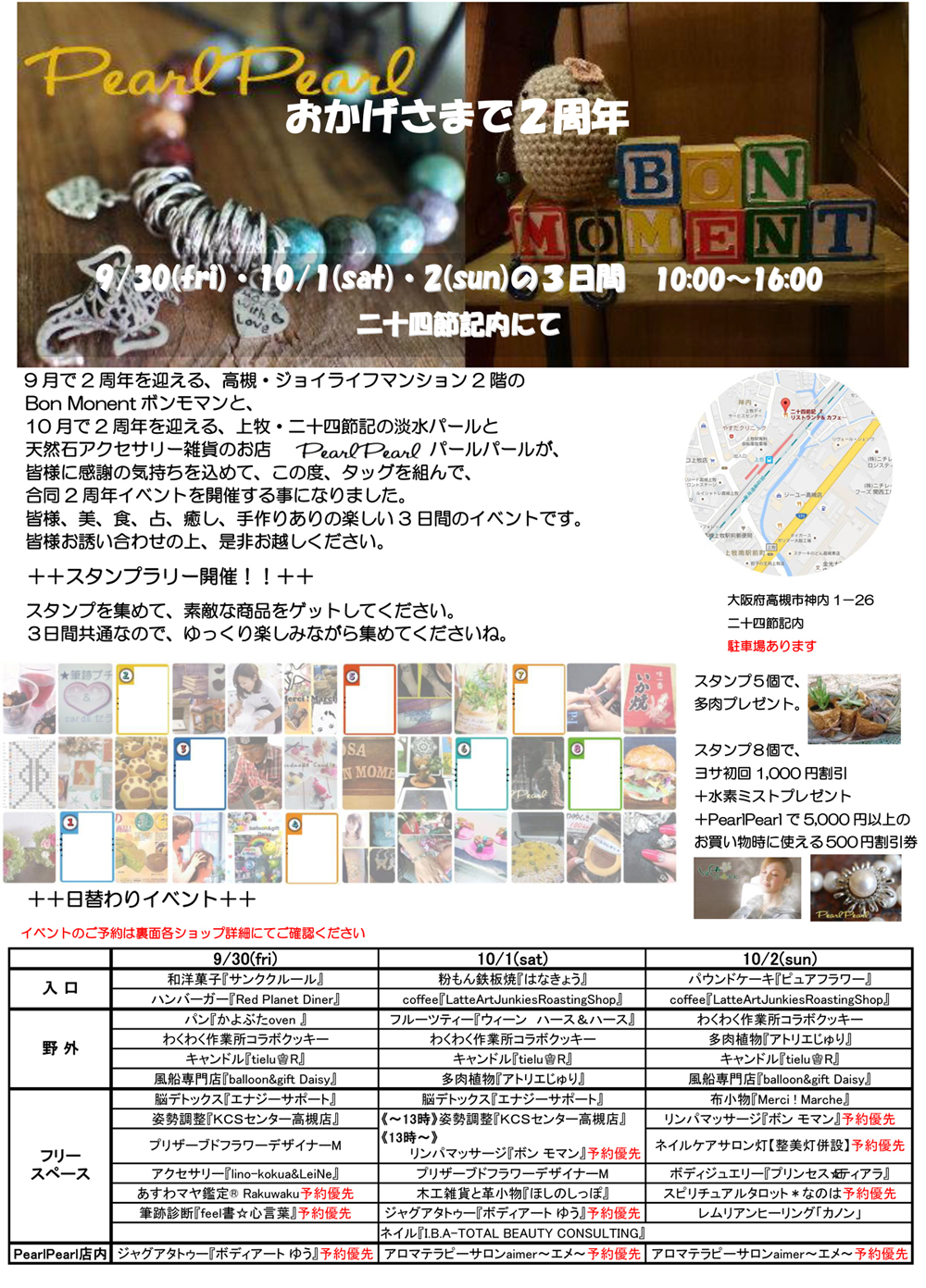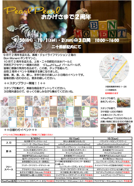 おかげさまで2周年イベント PearlPearl 高槻、上牧、二十四節記、淡水パールと天然石アクセサリーのお店のPearlPearlと高槻「Bon Moment」の2周年合同イベントが9月30日から3日間開催されます。 詳細・ショップページへ 投稿日:2016/09/30(Fri) 06:54記事No:189