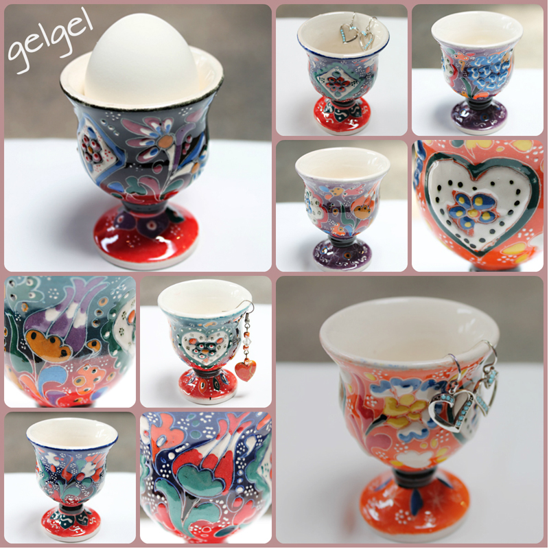 トルコ☆キュタフヤ陶器のエッグスタンド トルコ雑貨ぎゃるぎゃる 倉敷 キュタフヤは、歴史あるトルコ陶器の産地です。そこの職人さんの手描きによって、トルコの国花チューリップや、幸せを呼ぶ花と信じられているカーネーション、またトルコの魔除けナザールボンジュウのお花などがカラフルに盛り上げた手法で描かれています。ぐるりと数種類描かれていますので、見る角度によって表情を変えてくれます。朝食で卵を乗せると、朝から幸せな気持ちになることでしょう♪ピアスや指輪などのアクセサリーを飾っても可愛いです☆サイズ(約)高さ7.2cm、直径6cm。 詳細・ショップページへ 投稿日:2019/07/02(Tue) 11:27記事No:3221