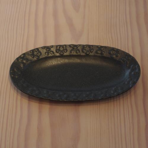 よしざわ窯 チャコール楕円皿フラワー メアリー・ブラウン チャコールグレーの楕円形のお皿です。色合いは、均一ではなく、黒っぽかったり、グレーみたいに見えたりするところもあって、写真ではわかりにくいかもしれませんが深く落ちついた色合いです。また小穴や白い点がみられるところもあります。リム部分に凹凸のあるお花模様がデザインされています。落ちついた色合いにお花模様で甘すぎないかわいさがあります。サイズ:縦13.5 × 横26cm 高さ3cm 生産地:日本(益子焼 よしざわ窯) 詳細・ショップページへ 投稿日:2016/09/23(Fri) 15:54記事No:1052