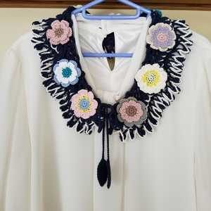 ネイビーお花モチーフ付き 付け襟 手作り雑貨ニットのお店 Charin * ネイビーお花モチーフ付き 付け襟サイズ/約15cm×68cmカラフルなお花モチーフがついたネイビーカラーのコットンの付け襟になります。付け方は簡単で肩に乗せて紐でサイズを調節してください。 詳細・ショップページへ 投稿日:2018/06/12(Tue) 12:17記事No:1275