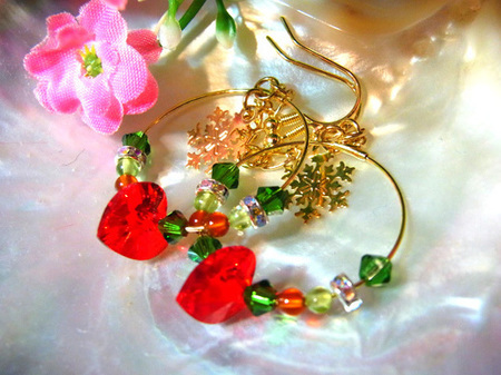 クリスマスゴールドスノーピアス STONE IRIS~ストーン イーリス ☆STONE IRIS☆の店長のなっちゃんです♪もうSTONE IRISのショップはご覧いただけましたか?さてもうすぐ皆大好きクリスマスがやって来ます!そんなクリスマスカラーいっぱいの華やかなピアスのご紹介です♪スワロフスキーを使いキラキラ感をUP☆ハートの赤いスワロフスキーがキュートで気分も上がりますよぉ↑↑ゴールドカラーの雪の結晶がゆらゆら揺れる可愛らしいピアスです。使用している石は3mm玉のカーネリアンとペリドットの2種類です。是非ご覧ください!! 詳細・ショップページへ 投稿日:2015/11/13(Fri) 17:44記事No:99