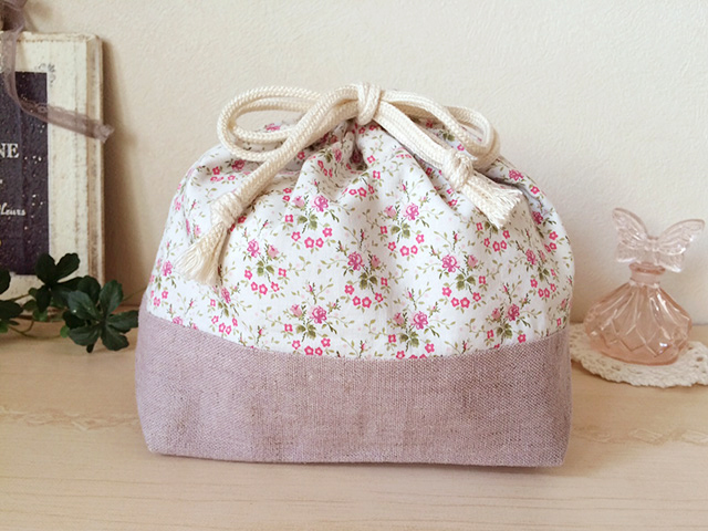 ランチボックスきんちゃく bdstore リバティ(Jemima's Posy)を使用した、お弁当箱入れです。ピンクの花柄が可愛らしい生地に、グレイッシュピンクのリネンを合わせました。 詳細・ショップページへ 投稿日:2016/02/04(Thu) 18:24記事No:860
